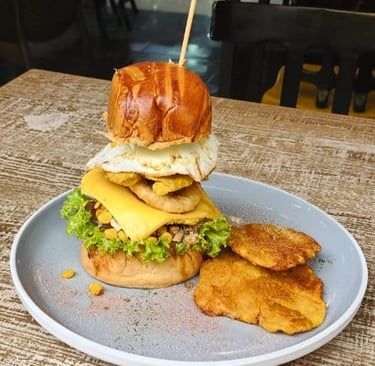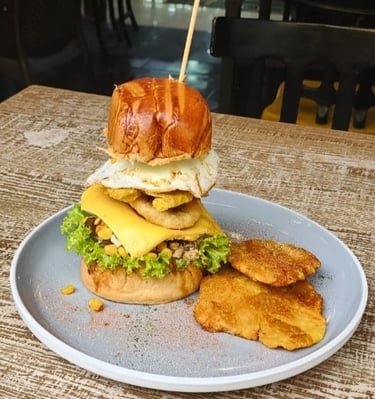 Patacón dulce, huevo frito y aguacate, queso muzzarella / cheddar y salsas artesanales.